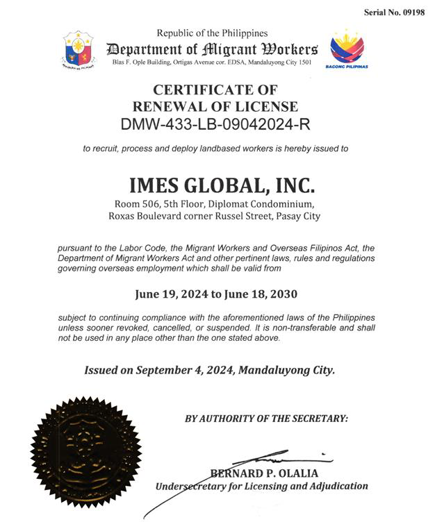 IMES GLOBAL is an overseas recruitment agency authorized by the Philippine government’s Department of Migrant Workers.